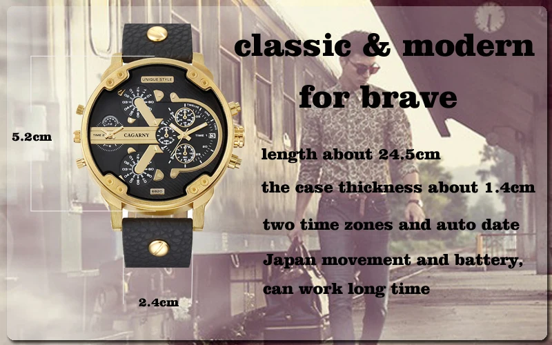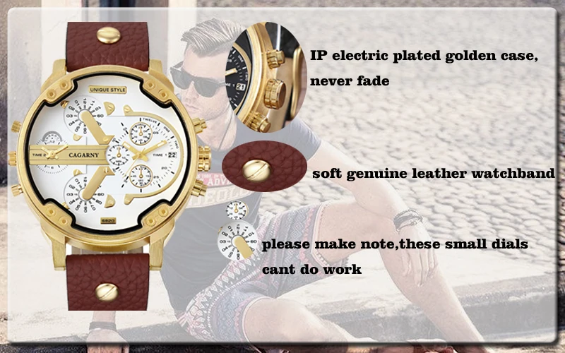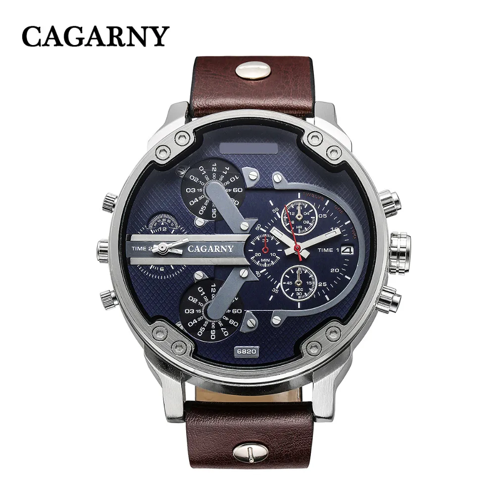 Cagarny Men's Watches Men Fashion Quartz Wristwatches Cool Big Watch Leather Bracelet 2 Times Military Relogio Masculino D6820