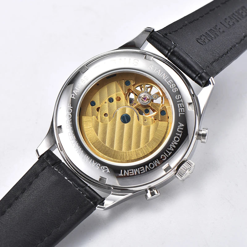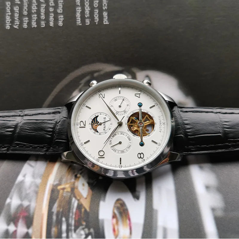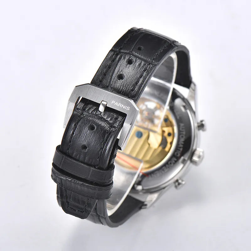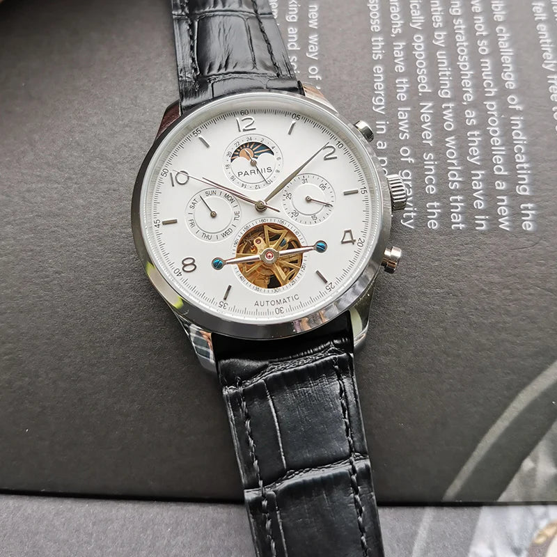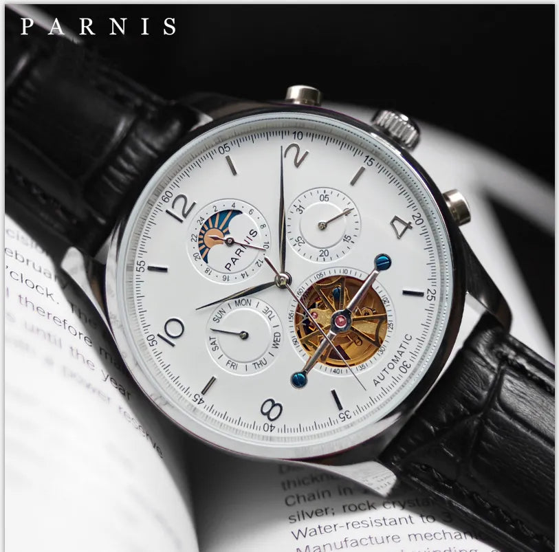 Parnis 43mm White Dial Automatic Men's Watches Moon Phase Calendar Men Wristwatch JHS35 Movement Mechanical Man Clock Box Gift