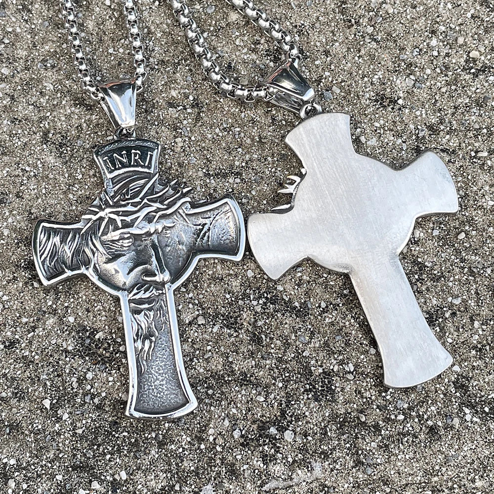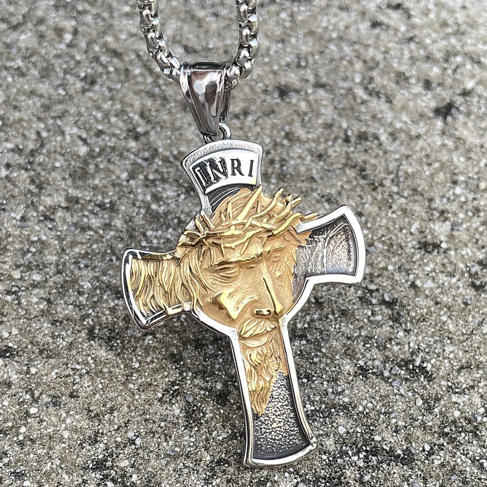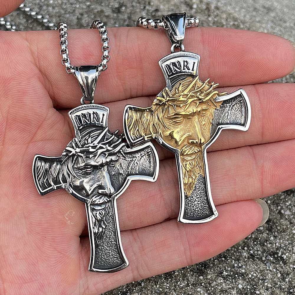 Stainless Steel Jesus Face Cross Pendant Necklace Men Boy Vintage Catholic Cross Jesus Necklace Chain Amulet Jewelry Gift